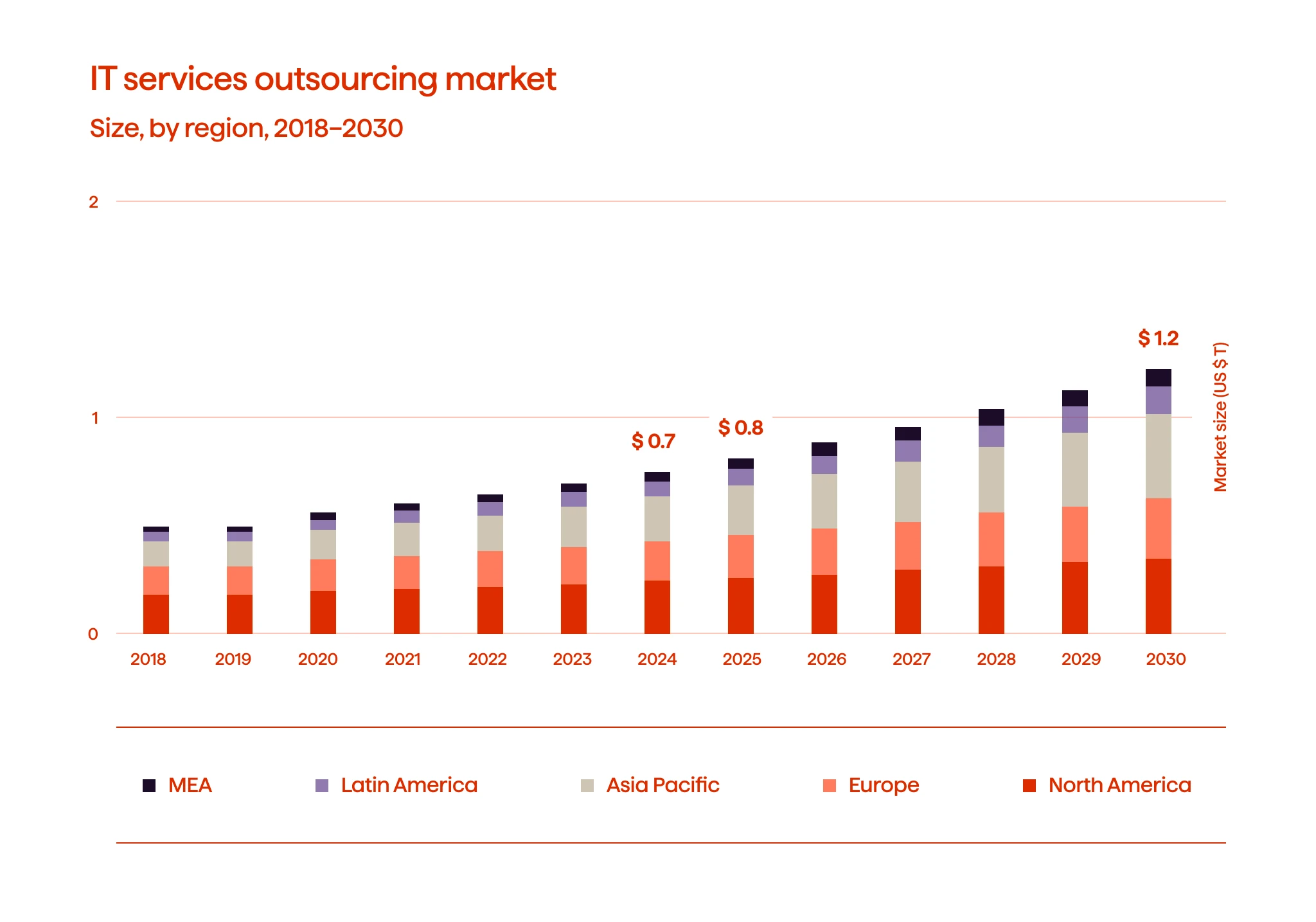 从宏观经济数据的角度来看,IT服务外包市场的增长潜力巨大。根据Grand View Research的数据,2024年全球IT服务外包市场估值已达7446亿美元。更令人瞩目的是,预计到2030年,这一数字将攀升至1.21万亿美元。这一增长轨迹意味着市场将保持8.6%的年复合增长率(CAGR)。