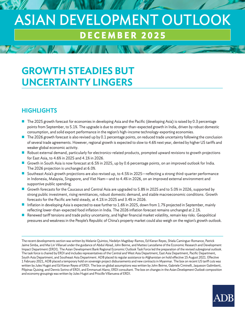 亚洲开发银行最新报告上调了亚太发展中经济体的增长预测。受益于半导体等科技出口韧性及贸易协定落地,区域基本面稳健。预计2024年经济增速达5.1%,较9月预测上调0.3个百分点。这反映了全球需求回暖对出口的拉动,有效缓解了贸易不确定性。