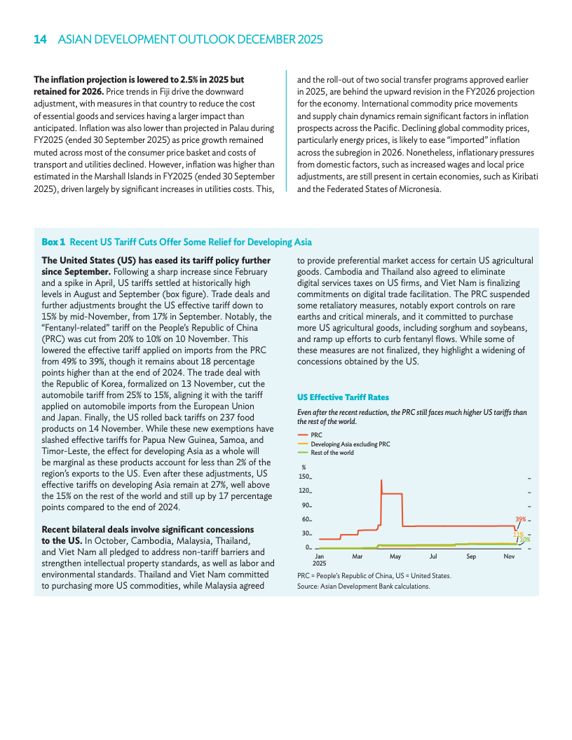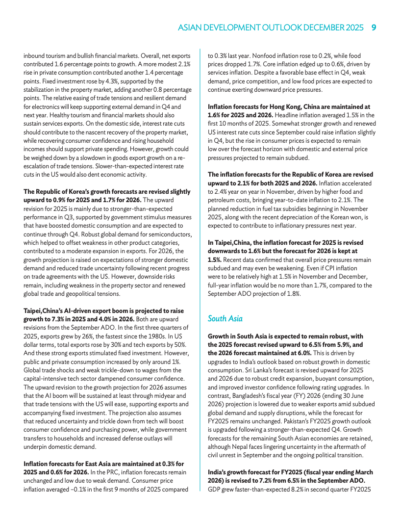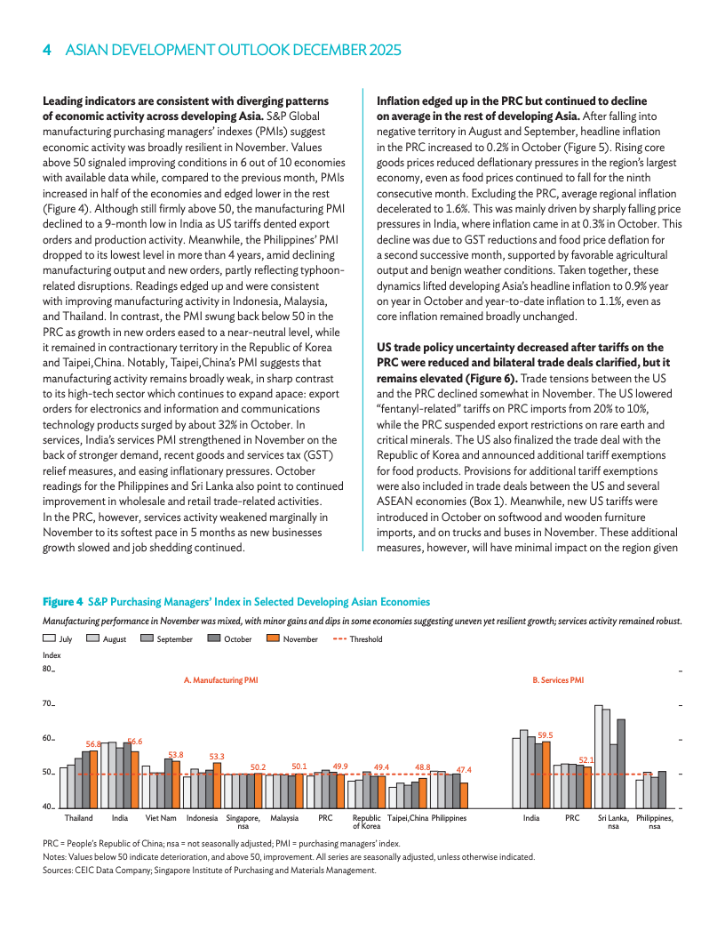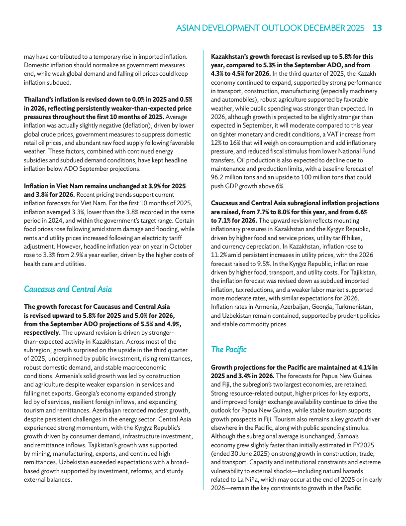 高加索与中亚本年度增长预期升至5.8%,东南亚预期升至4.5%。太平洋地区增速预估维持在4.1%和3.4%。亚太新兴经济体今年通胀预期降至1.6%,主因印度食品价格涨幅不及预期。2025年通胀预期保持在2.1%。各区域在政府支出与消费需求带动下展现出多元动能。