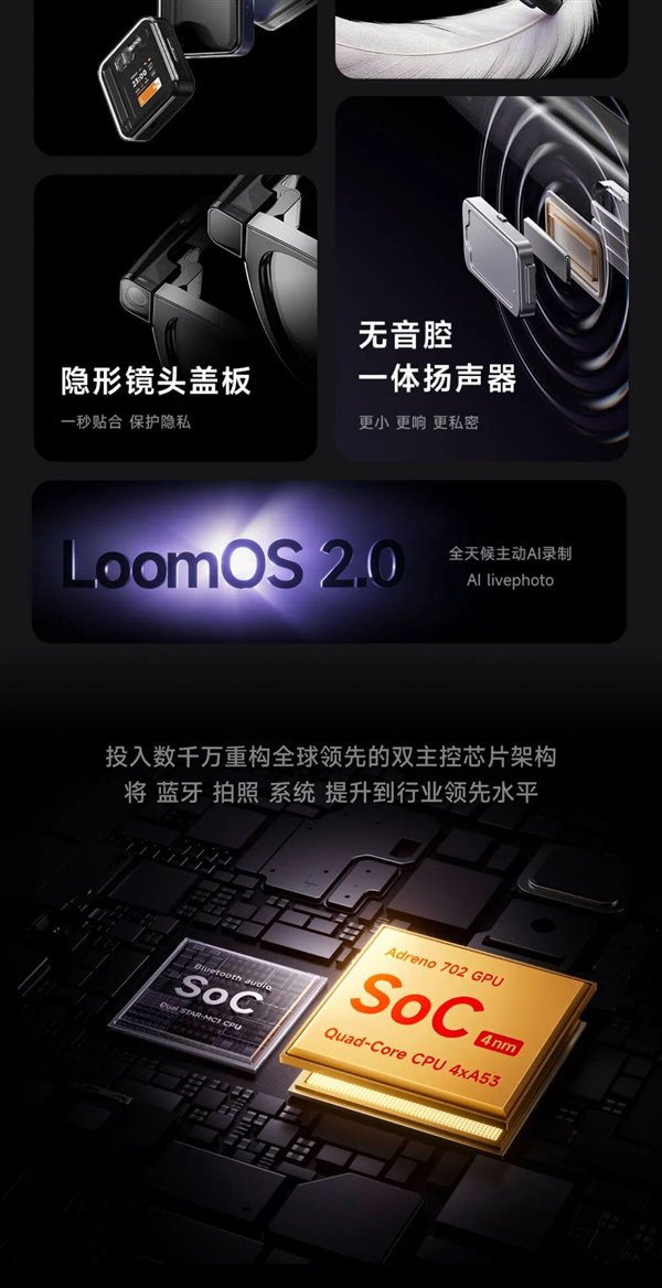 核心亮点在于LoomOS 2.0主动AI记忆系统,联合memories.ai开发的AI引擎可自动录制AI实况照片,整理生活片段,生成个人记忆库并支持检索、总结及精彩短片生成。