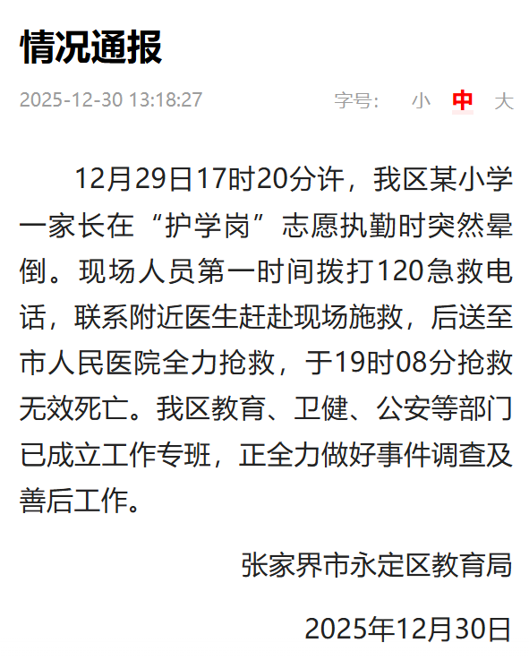 12月29日17时20分许,永定区某小学一家长在“护学岗”志愿执勤时突然晕倒。现场人员第一时间拨打120急救电话,联系附近医生赶赴现场施救,后送至市人民医院全力抢救,于19时08分抢救无效死亡。永定区教育、卫健、公安等部门已成立工作专班,正全力做好事件调查及善后工作。