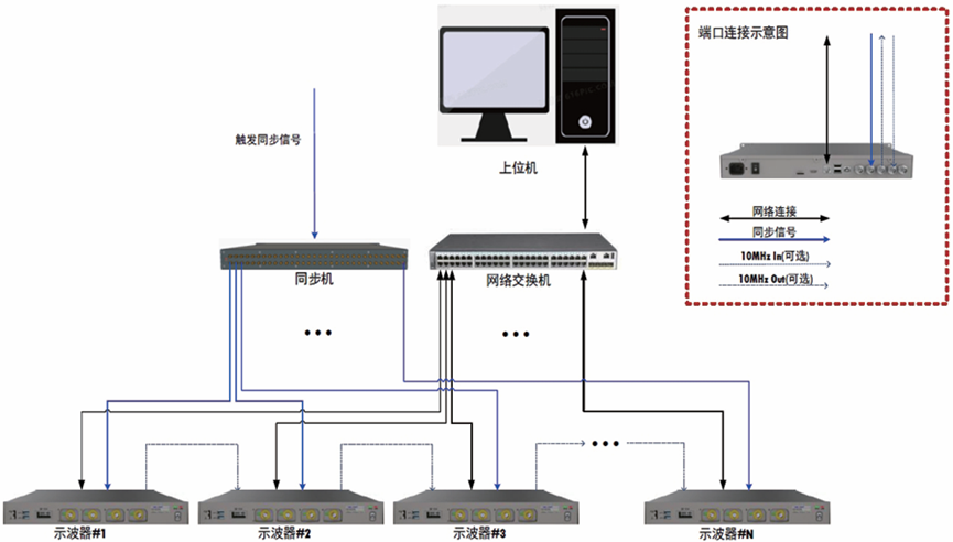 • 通过同步机触发多台(最多64台)示波器同步采集,最多支持扩展至256个模拟通道