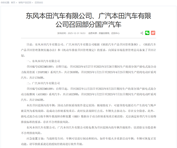 快科技12月31日消息,日前,东风本田汽车有限公司、广汽本田汽车有限公司向国家市场监督管理总局备案了召回计划。