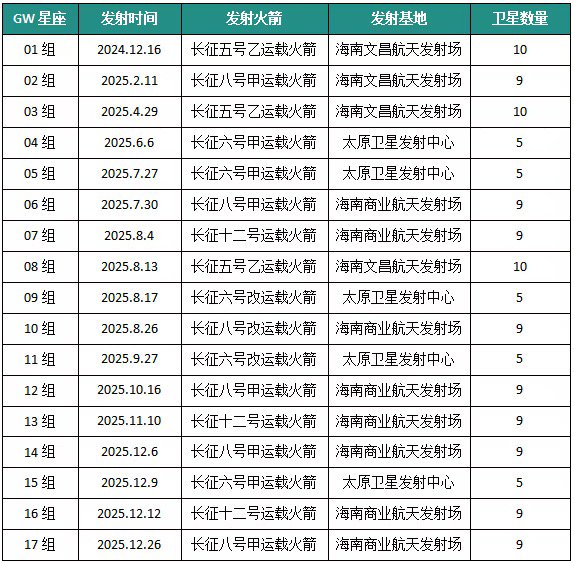 除技术突破外,低轨卫星互联网星座组网进入“高密度发射、规模化部署”关键期。低轨卫星互联网组网进入“高密度发射期”。截至 2025年12月31日,两大星座在轨卫星均突破百颗。其中,中国星网 GW 星座累计发射17组低轨卫星,目前已部署136颗卫星。