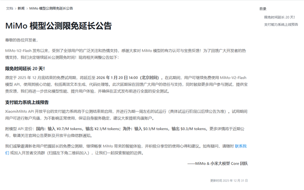 今日,MiMo&小米大模型Core团队宣布,原定于2025年12月底结束的免费试用期,将延后至2026年1月20日14:00。