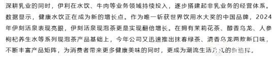 后伊利在2024年11月的业绩说明会上提到,水饮业务中现泡茶产品增长很快,2023年因为产能限制,出现供不应求的情况。此外,伊利在官方公众号发文称,伊刻活泉现泡茶在2024年实现翻倍增长,为“近年来表现最 好的新品之一”。