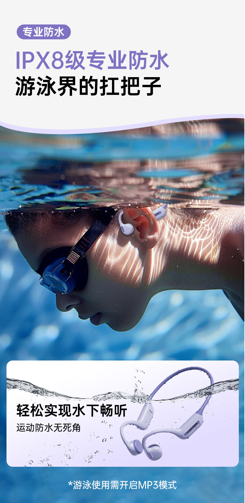 蓝牙信号无法在水下传输,因此Beta2pro专为游泳场景设计了“内存模式”——内置32G超大内存,支持MP3格式文件直接存储,无需连接手机即可实现水下聆听。更令人惊喜的是其“水下音效增强95%”技术,针对水下声音传播特性进行优化,即便在泳池中,低中高频的表现依然清晰均衡,即便在水声干扰下,也能清晰捕捉音乐细节,让长距离游泳训练不再枯燥。