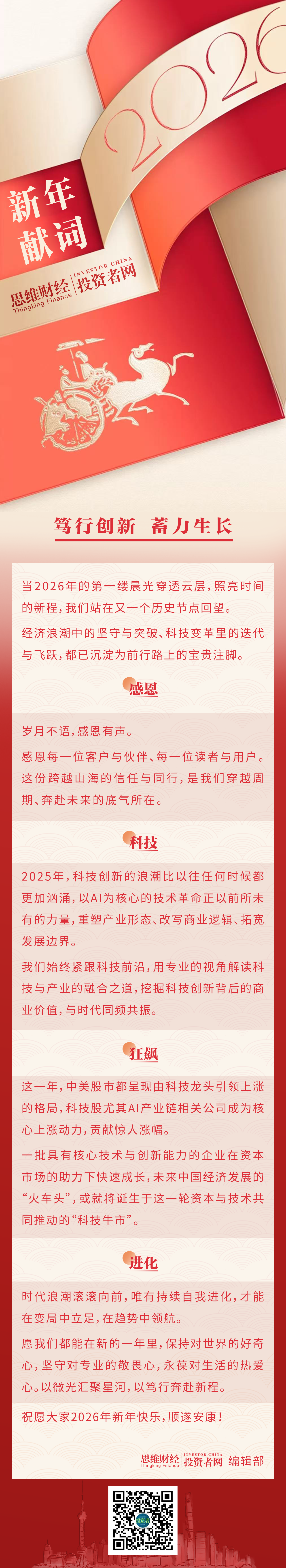 感恩这一年里的每一次挑战与成长。2025年,我们见证了宏观政策的精准发力,也亲历了市场波动的考验;目睹了部分行业的转型阵痛,也欣喜于新质生产力的蓬勃兴起。正是这些经历,让我们愈发沉稳、愈发坚定,在变局中找准方向,在磨砺中积蓄力量。