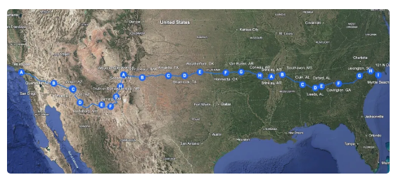 摩斯从加州的一家特斯拉超级充电站出发,最终抵达南卡罗来纳州的默特尔海滩。全程共计2732.4英里(约4397公里),耗时2天又20小时。