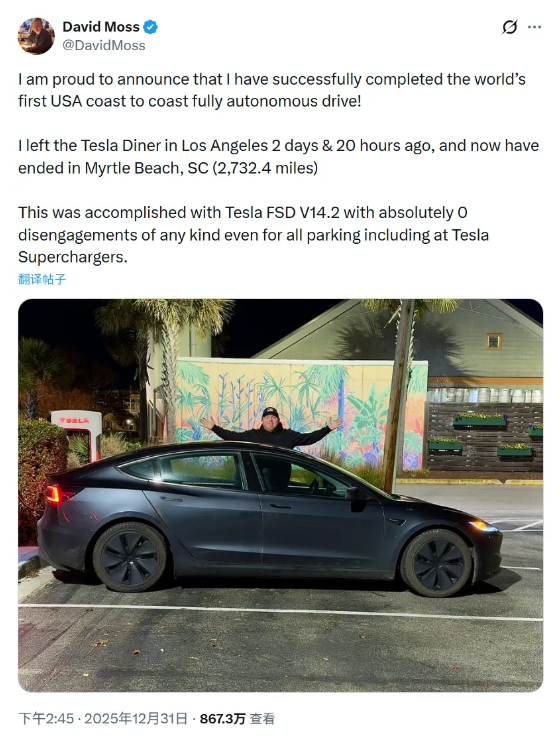 快科技1月1日消息,据媒体报道,特斯拉车主大卫·摩斯(David Moss)完成了一项极具象征意义的挑战:他坐在自己的Model 3中,全程未进行任何干预,任由车辆以自动驾驶方式从美国西海岸行驶至东海岸。