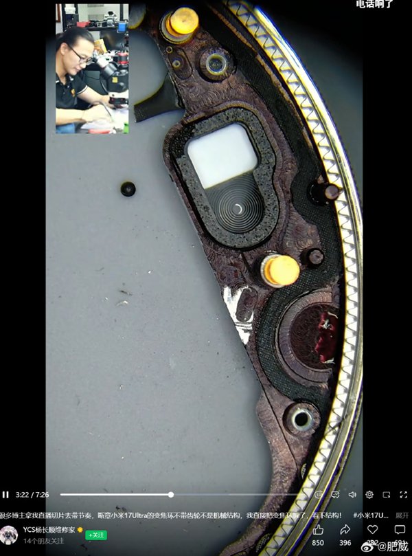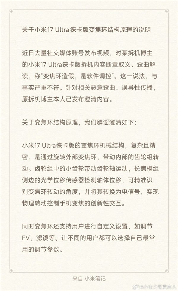 小米官方表示,近日大量社交媒体账号发布的视频,对某拆机博主关于小米17 Ultra徕卡版的拆机内容进行了断章取义和歪曲解读,错误地声称其“变焦环造假,是软件调控”。