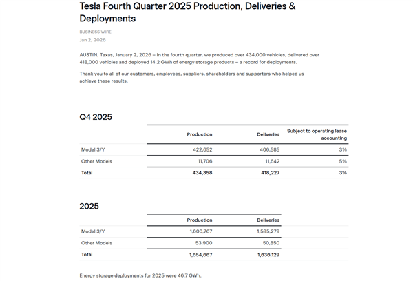 根据特斯拉官网挂出的数据,去年最后3个月共交付418227辆新车、生产434358辆;全年交付1636129辆,生产1654667辆。最终数据不仅低于大多数分析师预期,也低于本周初公司自己制作的“市场共识预期”。