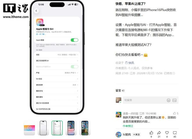 1 月 4 日消息,@hi爱疯 等多个博主及其粉丝反馈称,苹果至少从 1 月 2 日开始就已经面向部分国行设备开启“Apple 智能与 Siri”灰度测试,拥有测试资格的用户可通过设置进行查看。