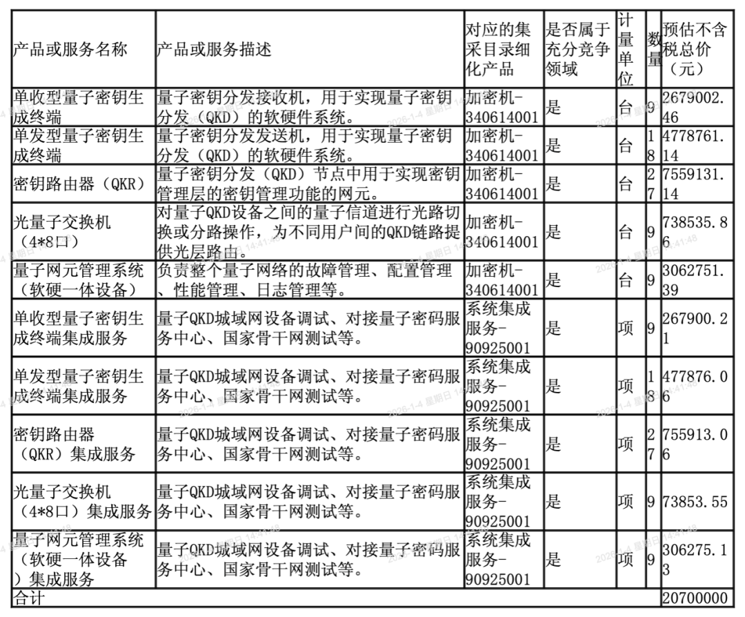 本项目计划采购密钥终端设备、量子城域网配套设备的供货及相应集成服务。具体如下: