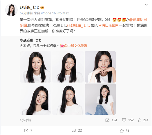 快科技1月5日消息,今日,15岁女孩“七七”时隔近半年官宣进组拍戏。