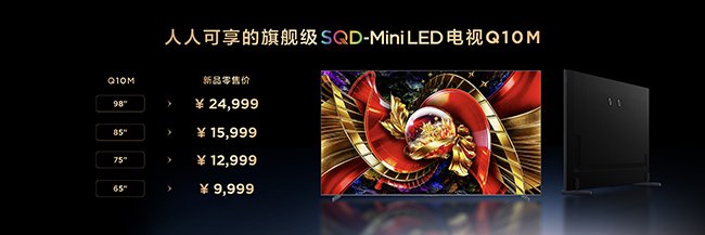 与此同时,人人可享的SQD-Mini LED旗舰级产品TCL Q10M也一并上市,同样搭载SQD-Mini LED技术,拥有碾压同价位产品的100% BT.2020全局高色域,配备最新的超级量子点技术,屏幕也直接一升到顶,配备超级蝶翼华曜屏,98吋、85吋、 75吋、65吋零售价分别为24999元、15999元、12999元、9999元。作为技术普惠的标杆之作,Q10M代表着TCL大幅降低了SQD-Mini LED体验门槛,让用户真正触手可及。