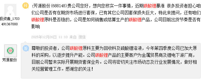 来源:投资者互动平台,下同芳源股份介绍,公司碳酸锂原料主要为回收料及硫酸锂溶液,2025年第四季度公司已加大原料的采购,以逐步提升产能。