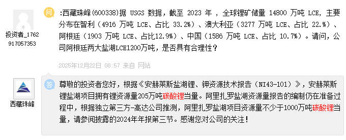 西藏珠峰称,公司安赫莱斯锂盐湖项目拥有锂资源量205万吨碳酸锂当量,阿里扎罗盐湖资源量报告的编制仍在准备过程中,根据独立第三方公司推测,阿里扎罗盐湖项目资源量不少于1000万吨碳酸锂当量。