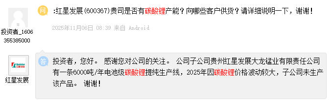 红星发展表示,公司子公司贵州红星发展大龙锰业有限责任公司有一条6000吨/年电池级碳酸锂提纯生产线,2025年因碳酸锂价格波动较大,子公司未生产该产品。