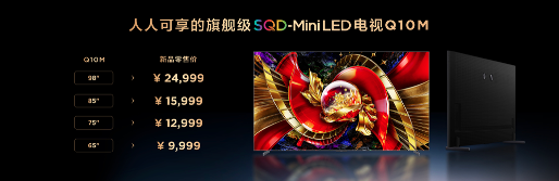 与此同时,人人可享的SQD-Mini LED旗舰级产品TCL Q10M也一并上市,同样搭载SQD-Mini LED技术,拥有碾压同价位产品的100% BT.2020全局高色域,配备最新的超级量子点技术,屏幕也直接一升到顶,配备超级蝶翼华曜屏,98吋、85吋、 75吋、65吋零售价分别为24999元、15999元、12999元、9999元。作为技术普惠的标杆之作,Q10M代表着TCL大幅降低了SQD-Mini LED体验门槛,让用户真正触手可及。