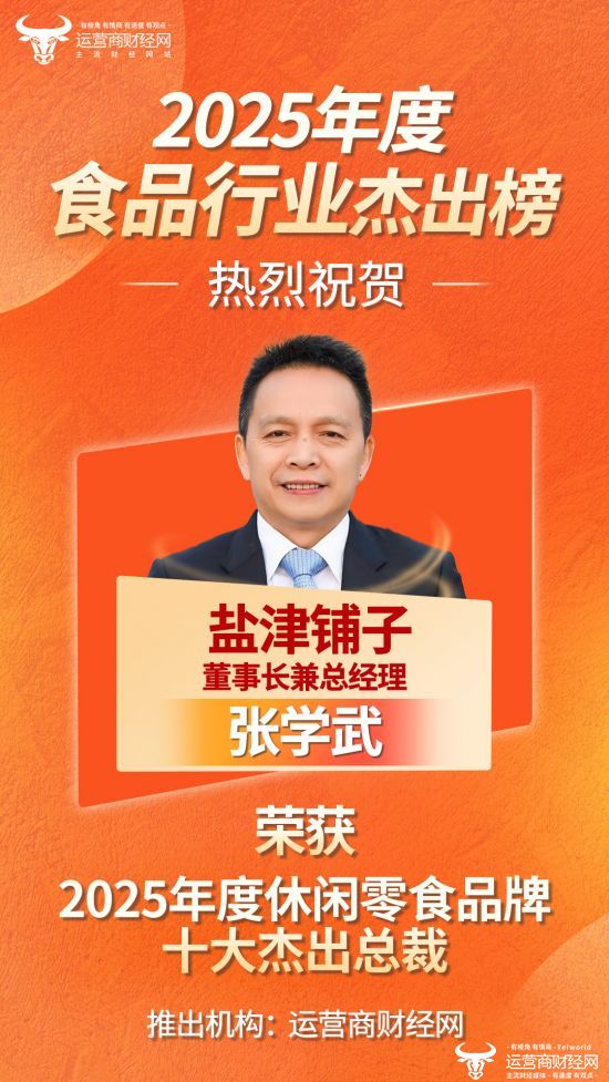 近日,运营商财经网正式公布“2025年度休闲零食品牌十大杰出总裁”榜单,盐津铺子董事长兼总经理张学武成功入选!