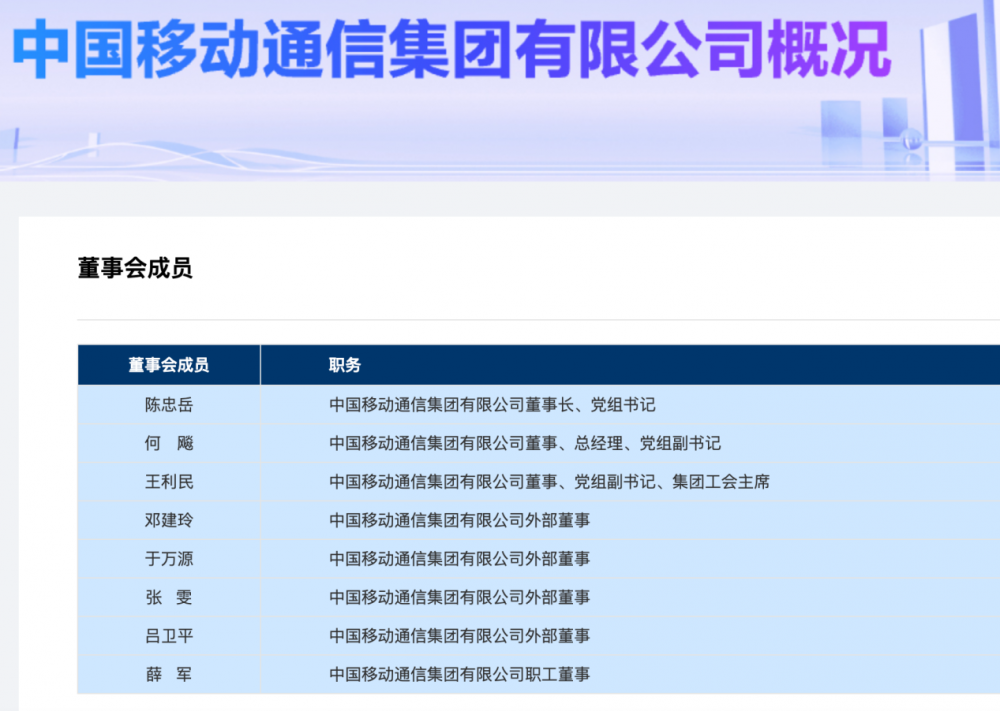 中国移动官网显示,中国移动通信集团有限公司董事长为陈忠岳,两名董事分别是何飚、王利民,另有四名外部董事:邓建玲、于万源、张雯、吕卫平,以及一名职工董事:薛军。