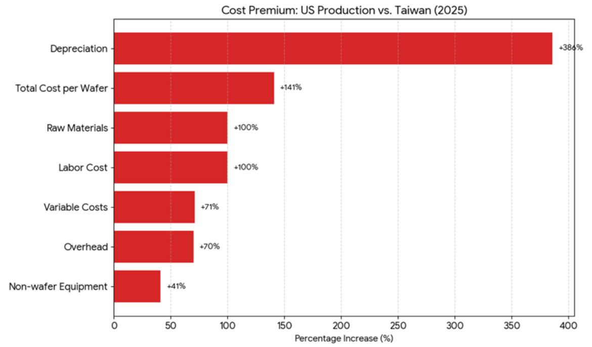 由于美国工厂运营成本高企,其中晶圆折旧成本飙升384%,成为拖累盈利的核心因素。简单来说,折旧成本就是晶圆厂及其生产设备在使用寿命内的损耗分摊。例如,如果美国一家工厂采用相同的工艺技术生产晶圆,但产量仅为中国台湾工厂的四分之一,这就意味着单片晶圆需分摊更高的固定资产摊销成本,这也是美国工厂单位晶圆折旧成本高出中国台湾4倍的关键原因。再叠加厂房建设和日常运营的高昂开销,美国晶圆厂需要靠更高的营收才能填平成本窟窿。