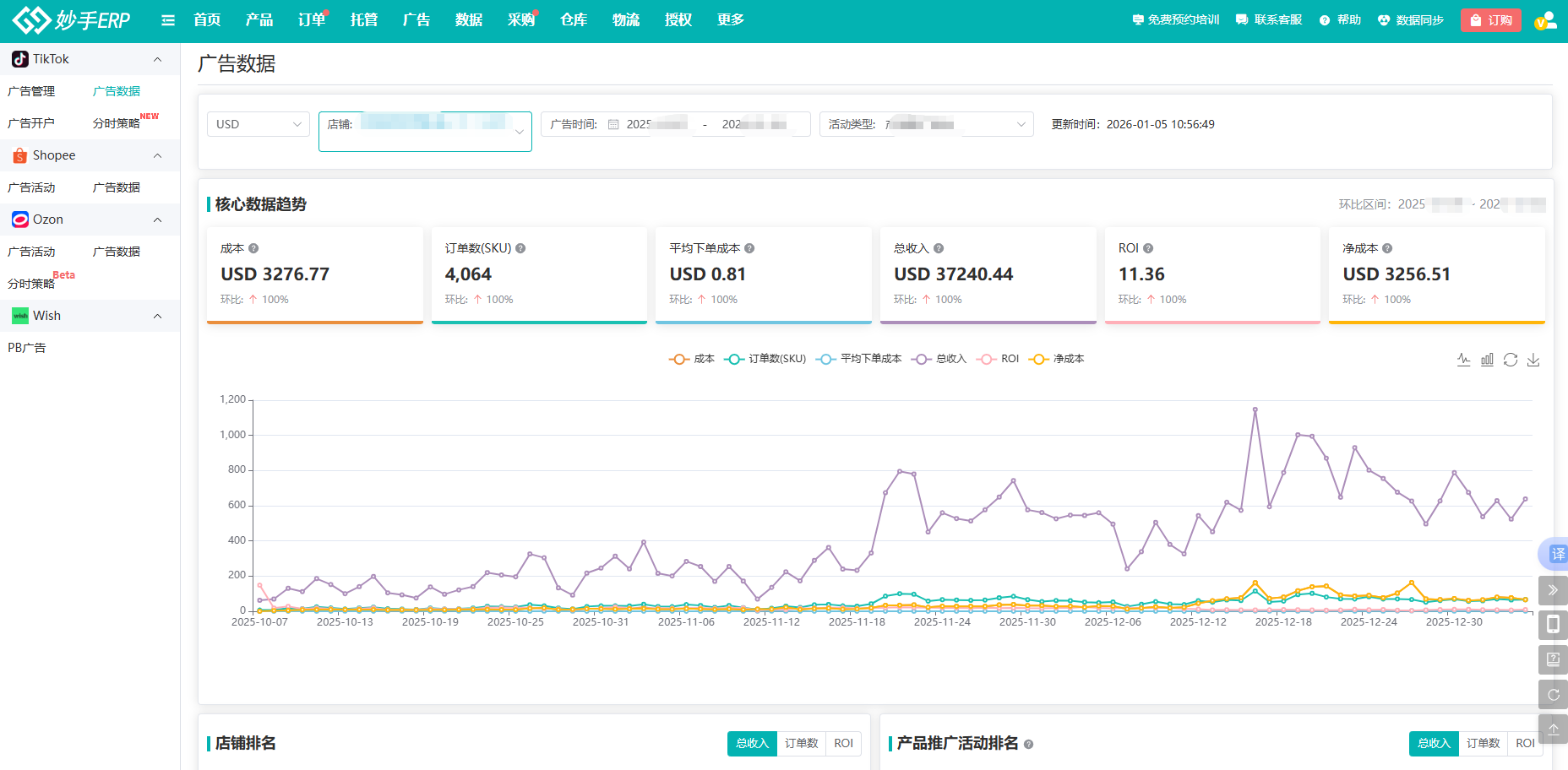 卖家可借助妙手TikTok Shop【广告数据】报表,快速追踪多店铺GMV Max广告成本、订单数、总收入、ROI及净成本等关键指标,并支持多维比对各店铺/广告计划投放表现,全局效果一屏掌握。