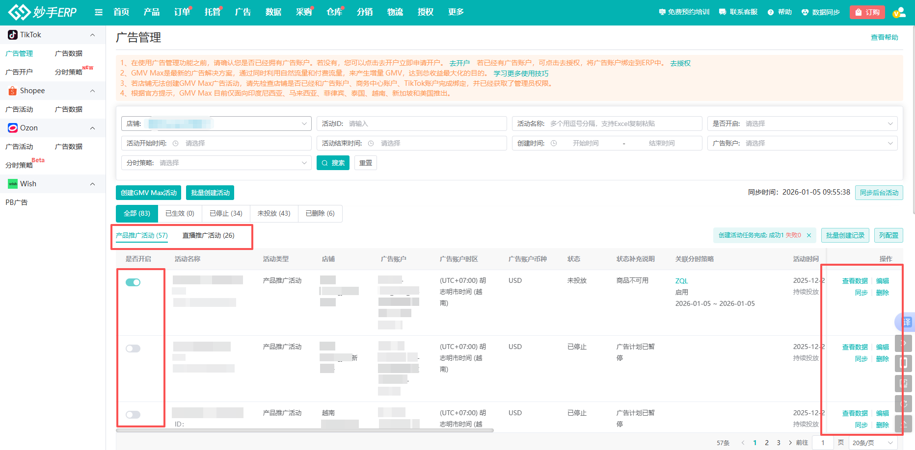 如需深入分析各广告计划的明细数据,卖家还可通过妙手TikTok Shop【广告管理】功能,进一步查看单个广告活动及对应投放产品或直播间的详细表现。