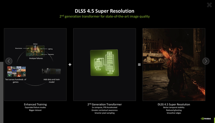 DLSS 4.5更新了第二代超级分辨率Transformer技术和与动态多帧生成技术。上一代DLSS 4已通过Transformer模型替代传统卷积神经网络(CNN),实现画质飞跃,此次DLSS 4.5进一步升级算法,训练数据集规模扩大,算力投入达初代DLSS 4 Transformer的5倍,同时引入FP8数据格式(由RTX 40/50系列Tensor核心支持),在保持画质提升的同时,仅带来轻微性能损耗;鬼影(Ghosting)现象显著减少, temporal稳定性与细节重建能力增强,像素采样更智能,能更精准还原画面细节。