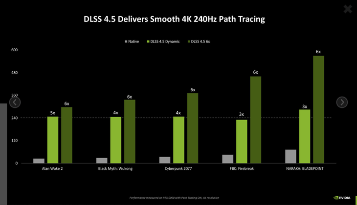 NVIDIA通过性能测试验证了DLSS 4.5的效能:在《心灵杀手2》《黑神话:悟空》《赛博朋克2077》等游戏中,DLSS 4.5 6x模式帧率较原生渲染提升显著(如《纳拉卡:剑点》达6倍,《FBC:Firebreak》达3倍),确保4K 240Hz路径追踪的流畅体验。