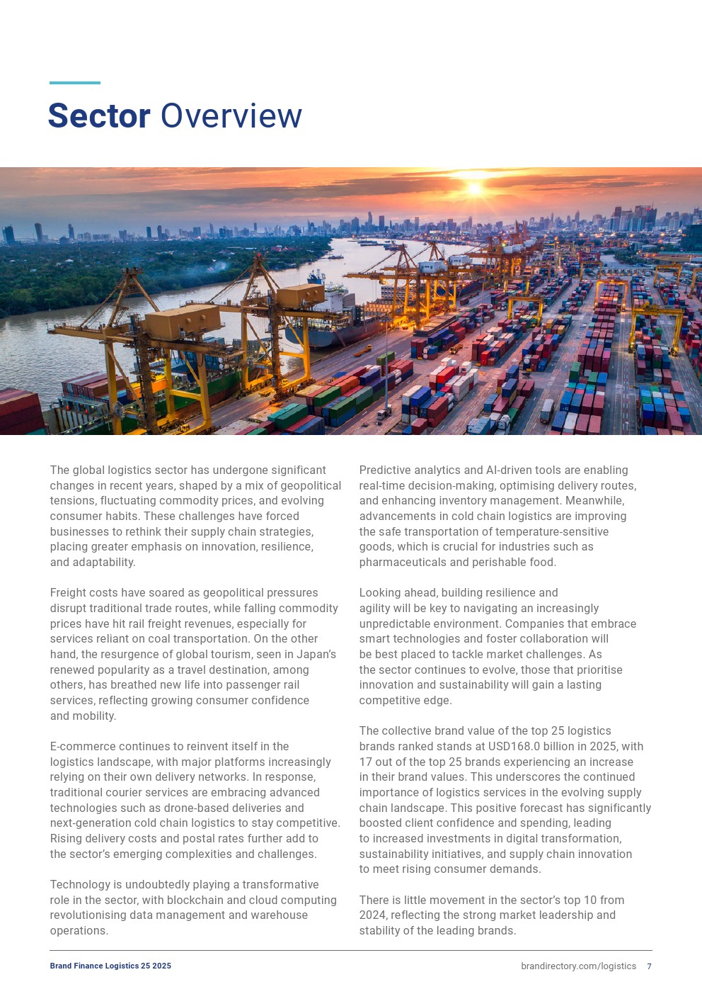 2025年,全球物流行业在地缘政治、技术革新与消费结构变化的多重作用下继续演进。Brand Finance数据显示,2025年全球物流品牌25强的品牌总价值达到1680亿美元,同比增长显著,其中25强中有17个品牌实现品牌价值正增长,显示出物流在全球供应链体系中的战略地位仍在强化。数字化转型、电商渗透与高附加值物流需求,是支撑行业品牌价值扩张的核心变量。