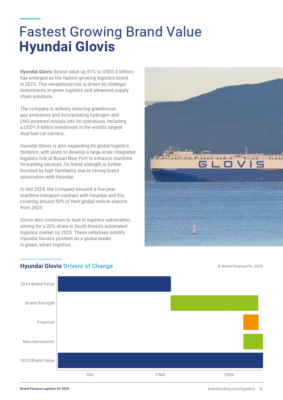 从增长速度看,现代格罗唯视成为2025年品牌价值增长最快的物流品牌,同比增幅高达81%,品牌价值升至30亿美元。其增长主要来自绿色航运投资、氢能与LNG动力船队布局,以及与现代、起亚锁定长期运输合同,体现出汽车产业链物流的结构性机会。