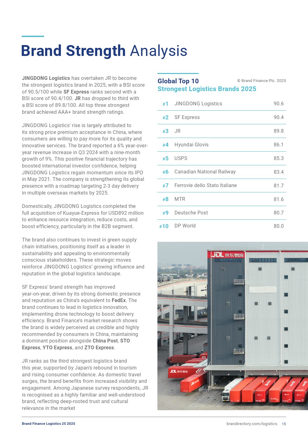 日本与欧洲品牌的分化趋势同样明显。日本JR品牌价值同比增长11%,达到133亿美元,跃居全球第三,主要受益于日本旅游业复苏与数字化服务创新。相较之下,DHL品牌价值下降8%至112亿美元,显示传统跨国快递在价格竞争与结构性成本上承压。铁路与综合物流品牌在区域经济复苏中表现更具韧性。
