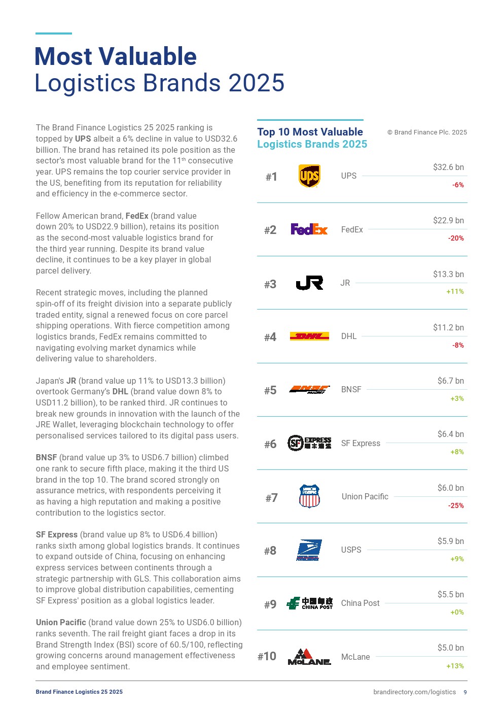 从品牌价值结构看,美国企业依旧占据主导地位。UPS以326亿美元的品牌价值连续第11年位居全球第一,尽管同比下降约6%,但其在电商履约、医疗冷链与高时效物流领域的长期投资,维持了行业标杆地位。FedEx以229亿美元排名第二,但品牌价值同比下滑近20%,反映出在成本压力和业务重组背景下,市场对其增长确定性的重新评估。