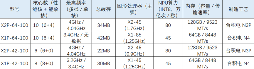 与骁龙 X2 Elite 芯片一样,骁龙 X2 Plus 系列采用高通 Oryon 架构,基于台积电 N3P 工艺节点制造。高通已将其异构架构中的内核重新命名为 Prime(性能核)和 Performance(能效核),但设计理念保持不变:Prime 核主打最高时钟频率,而 Performance 核则通过空间优化设计,以实现更出色的多线程性能。高端型号 X2P-64-100 共配备 10 个 Oryon 内核,分为 6 个 Prime 性能核与 4 个 Performance 能效核;X2P-42-100 则搭载相同的 6 个 Prime 性能核,但未配置 Performance 能效核。