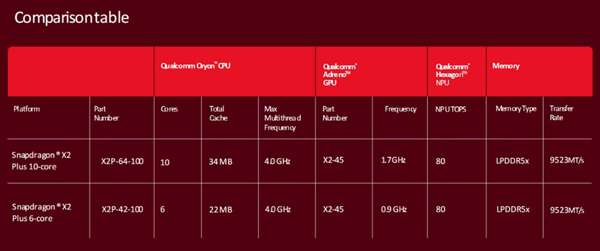 与第一代骁龙 X Plus 相比,高通对配置参数进行了部分调整。两款新机型的最高加速频率仍保持在 4GHz,但高通为入门级骁龙 X2 Plus SKU 采用了六核设计,而非上一代的八核方案。尽管高通尚未确认是否会推出更多衍生型号,但未来大概率会发布这些芯片的额外版本。