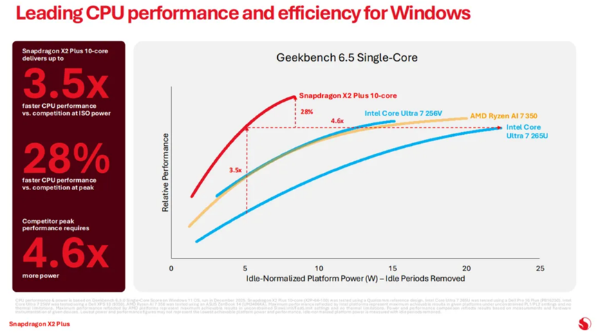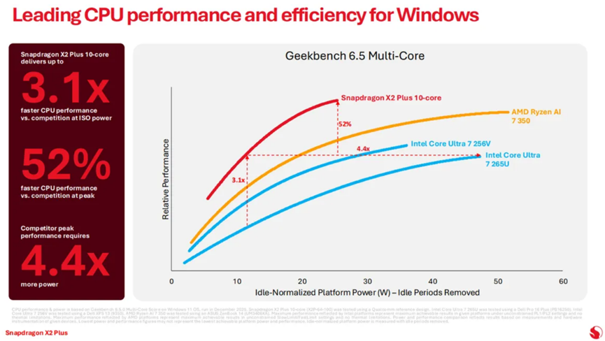 能效比是骁龙 X2 Plus 的 “杀手锏”,通过内核架构优化与功耗管控,实现 “性能与续航双赢”。 高通称,在 Geekbench 6.5 基准测试的等功耗条件下(本测试中分别取 5 瓦和 10 瓦功耗),X2P-64-100 的单核性能达到英特尔酷睿 Ultra 7 265U 的 3.5 倍,彻底解决传统 PC “高性能时续航跳水” 的痛点。多核性能达到后者的 3.1 倍。而在峰值功耗下,该型号的单核性能较酷睿 Ultra 7 265U 提升 28%,多核性能提升 52%。搭载该芯片的设备(如联想 IdeaPad Slim 5x)单次充电续航最高达 21 小时,15 分钟快充可支持 2 小时使用,完美适配移动办公、户外创作等场景,部分机型甚至可实现 “多日一充”。