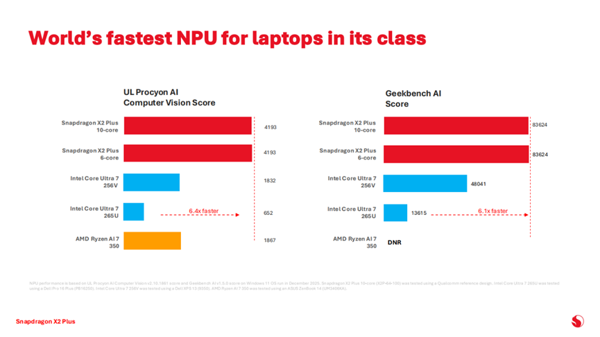 AI PC是X86阵营在2025年着力营销的PC推广新理念,自然成为骁龙X2 Plus平台本次升级的核心亮点,平台搭载的新一代Hexagon NPU(与骁龙 X2 Elite 及骁龙 X2 Elite Extreme 芯片所采用的型号完全相同)彻底打破行业算力瓶颈,满足微软 Copilot+ PC 的高阶需求。