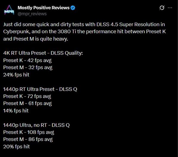 Mostly Positive Reviews团队在RTX 3080 Ti显卡上运行了《赛博朋 2077》的多项基准测试,对比了DLSS 4.5和 4.0的性能表现,结果发现,由于DLSS 4.5的计算量需求更大,性能竟然下滑达到了24%。