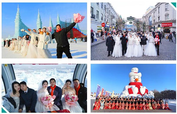一场专属冰雪浪漫之旅徐徐展开。新人们乘坐120米高的大雪花摩天轮,登高俯瞰银装素裹的北国风光,将冰城美景尽收眼底;在太阳岛雪博会,他们驻足于憨态可掬的“雪人先生”、气势磅礴的主塑“雪艳春”等雪雕作品前拍照留念,沉浸式体验“走着走着就一起白头”的人工降雪浪漫场景;在百年中央大街,他们手捧喜糖,与来自全球的游客分享新婚喜悦,让幸福气息弥漫在街头巷尾,成为冬日里最动人的风景。
