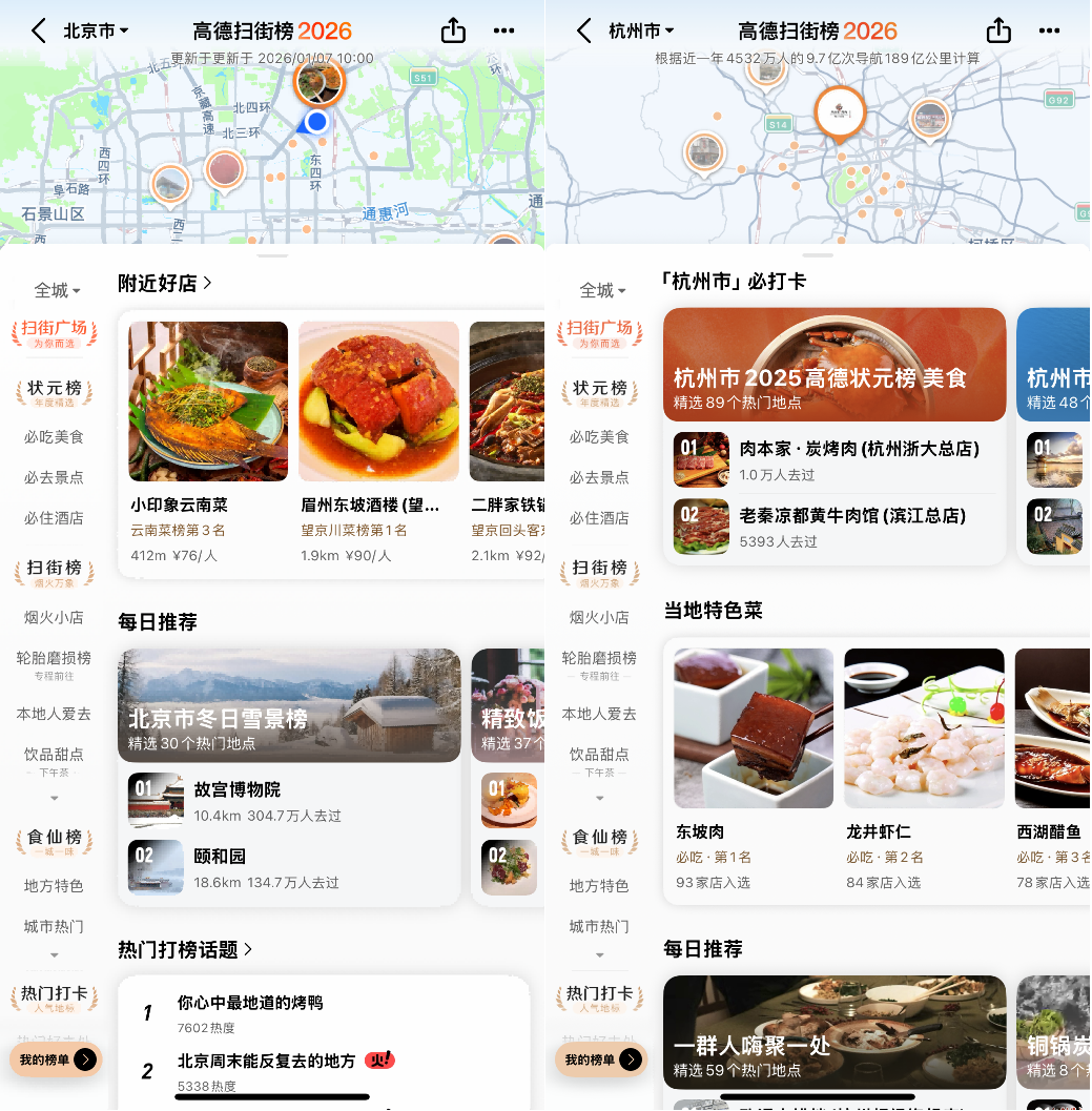 一年四季,每个区域都有当下的时令特色,例如北方的秋叶、冬天的雪,这些都是用户在此时此刻所需要的。而扫街榜想要还原的,正是用户最本质的生活节奏。目前,高德扫街榜2026已生成约6553个时令榜单。