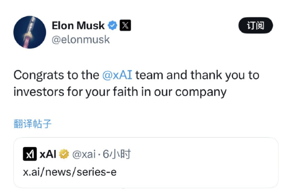 快科技1月7日消息,今日,马斯克发文祝贺xAI团队,并对投资者表示感谢。