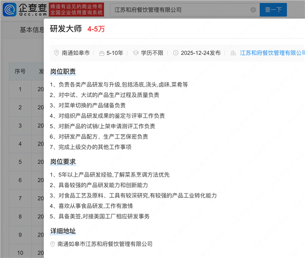 值得一提的是,江苏和府餐饮管理有限公司近期发布了“研发大师”岗位,月薪4-5万,岗位职责包括负责各类产品研发与升级,包括汤底,浇头,卤味,菜肴等。