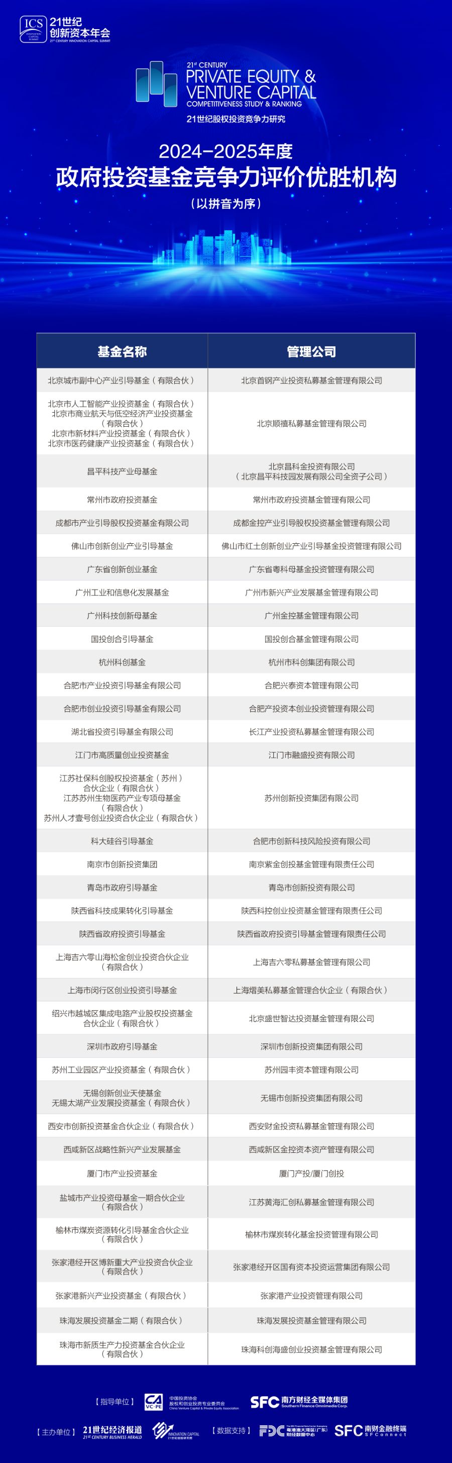 在过去大半年的时间里,我们通过机构走访、问卷调研、数据收集,并参照清科研究中心、投中嘉川CVSource数据、执中ZERONE、母基金研究中心等数据,进行综合分析,对各地方政府投资基金的政策目标、财务效益和管理水平等方面进行综合评价,现正式分布《2024—2025年度政府投资基金竞争力评价优胜机构》。