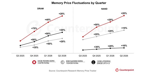 数据显示,2025年第四季度内存价格大幅上涨40%–50%,Counterpoint预计,2026年第一季度仍将再涨40%–50%,而2026年第二季度价格还将继续上涨约20%。
