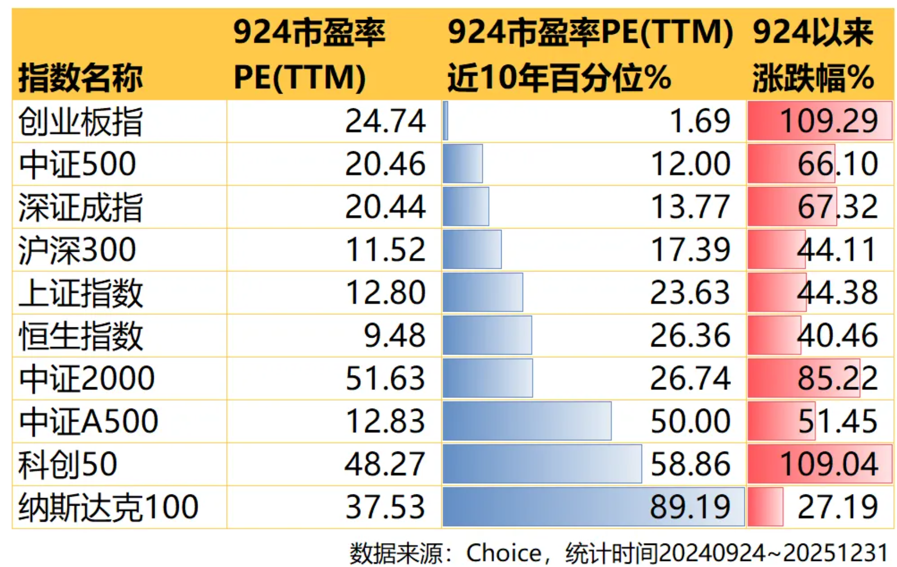 自“924”以来,低估的A股、港股指数明显跑赢高位的纳指100,尤其是当时接近历史最低估值的创业板指,更是大涨超过109%!
