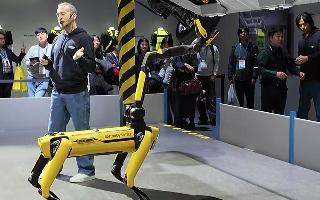 展厅内,波士顿动力黄色的机器狗正演示着车间内的实际工作场景,彩色Atlas吸引大量观众驻足拍照。据介绍,该公司计划在 2028 年前搭建一套年产能达数千台的机器人量产体系。