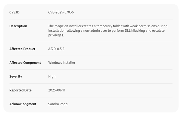 该漏洞编号为CVE-2025-57836,CVSS评分为7.8,它最早于2025年8月由安全专家Sandro Poppi发现。
