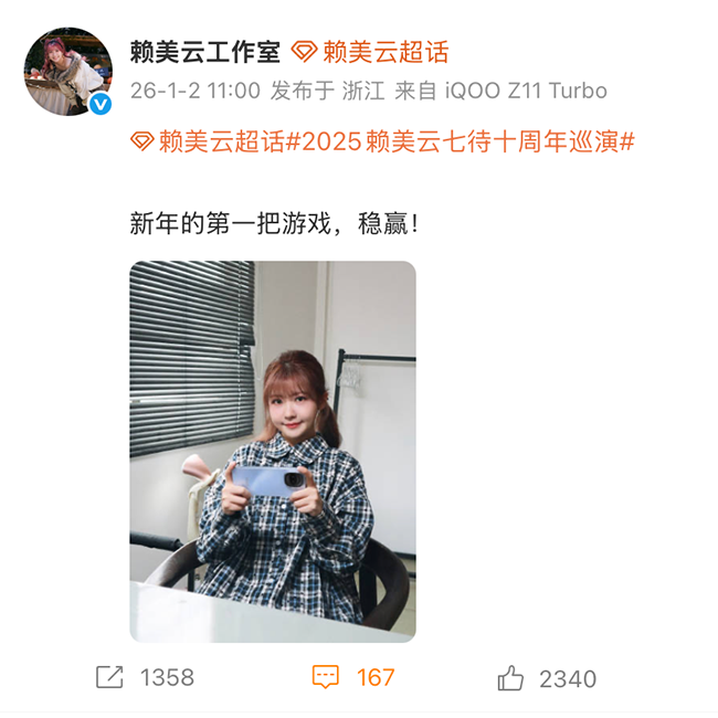@赖美云工作室 在早前的微博中晒出与iQOO Z11 Turbo同框的游戏画面,并配文:「新年的第一把游戏,稳赢!」瞬间点燃粉丝热情,评论区迅速刷屏「战斗精灵配小七,绝了!」「这手机和她一样又美又能打」。